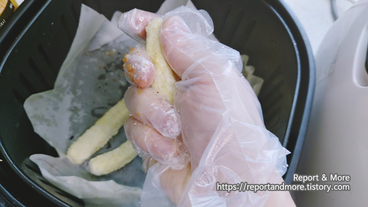 (2) 에어프라이어에서 기름을 바른 치즈스틱을 180도 예열된 상태에서 4분 + 뒤집어서 3분 하는 방법이 있습니다.