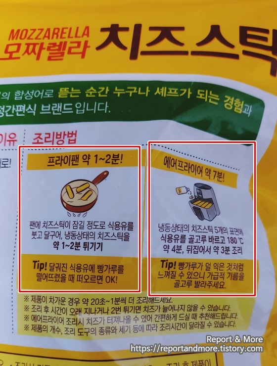 조리방법은 두 가지가 있는데, 그중에서 에어프라이어로 180도에서 7분 만에 조리가 된다고 되어 있네요.