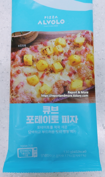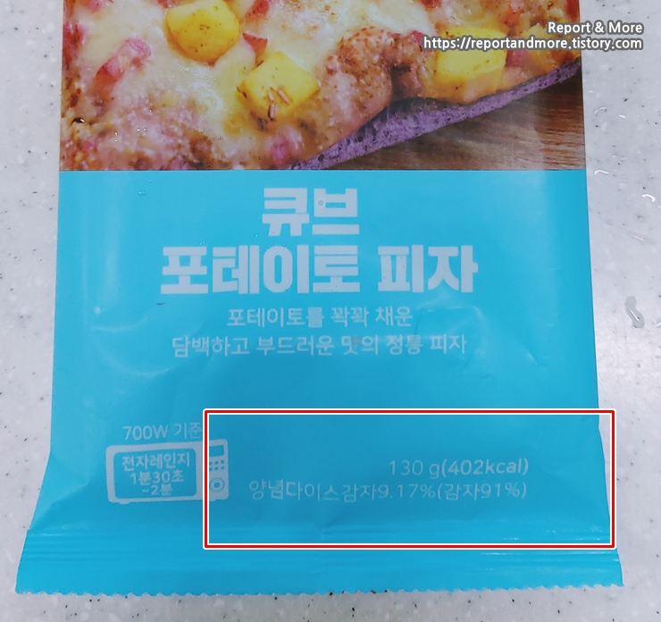 큐브 포테이토 피자는 130g에 402kcal의 열량을 가지고 있네요.