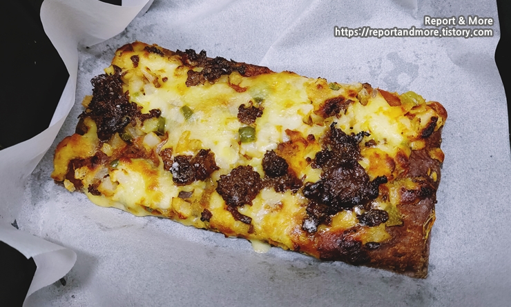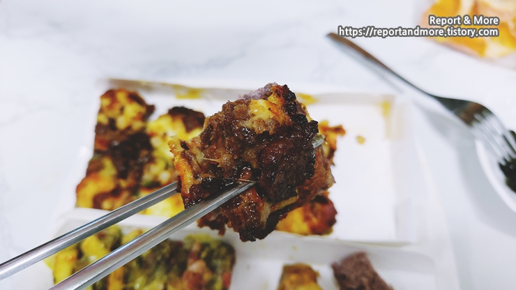 (4) 자연방목 채끝살 피자: 양념의 강한 맛 때문인지, 이 중에서는 그나마 피자라고 말할 수는 있으나, 자연 방목한 소가 엉덩이(채끝)만 보여주고, 도망간 맛