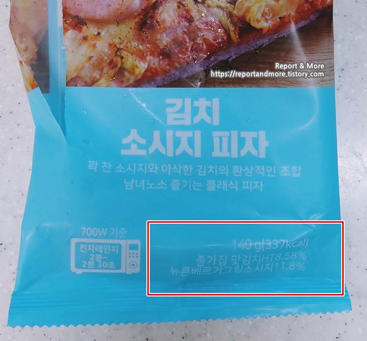 김치 소시지 피자는 140g에 337kcal의 열량을 가지고 있습니다.