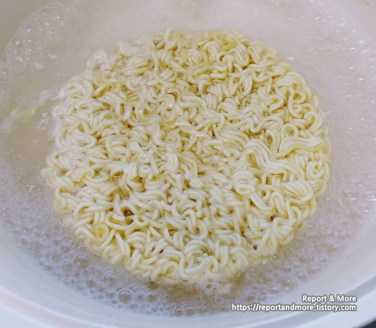 물을 끓이다가 -> 면과 건더기를 넣고 끓이다가 -> 물을 조금 남기고 버린 후, 분말스프와 조미유를 넣고 비벼 먹기 군요.