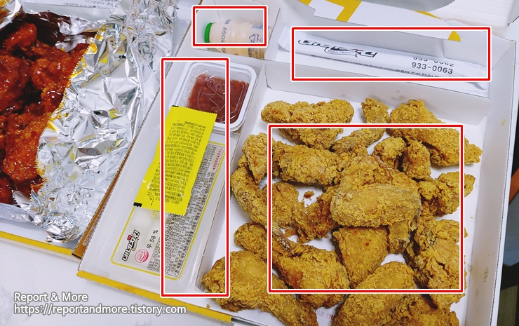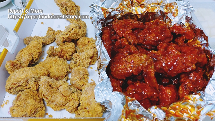왼쪽에 보이는 것이 매운맛인 쇼킹핫 치킨이고요, 오른쪽이 기본적인 후라이드 맛입니다.