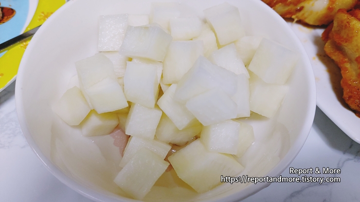 집에 만들어 두었던 치킨무와 함께 먹었습니다.