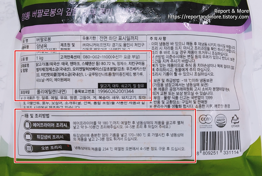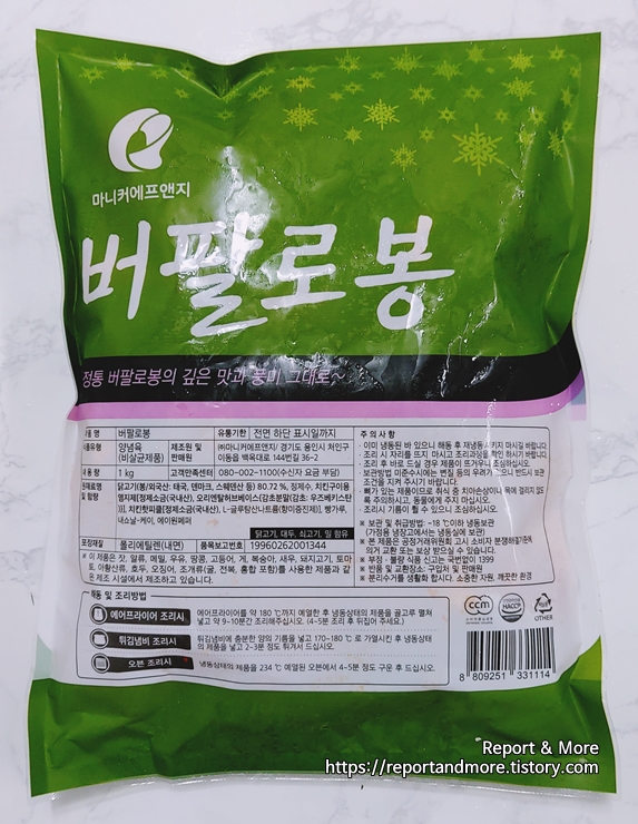 조리방법으로는 에어프라이어의 경우 180도에서 약 9~10분(뒤집으면서)으로 되어 있네요.
