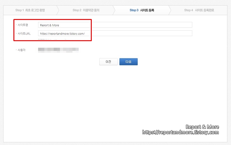 8. 등록하고자 하는 [사이트 명(블로그 이름)]과 [사이트 주소(블로그 url)]를 넣어주고, [다음] 클릭.