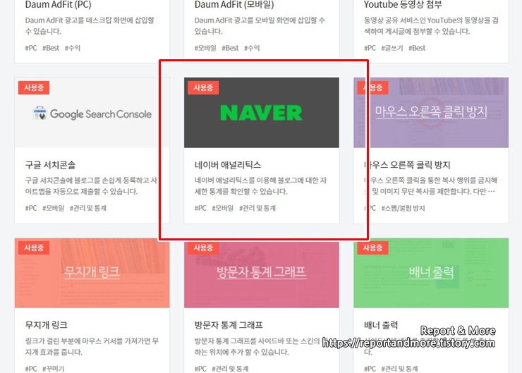 11. [티스토리 관리]에서 [플러그인]에 들어가보면, [네이버 애널리틱스] 위에 [사용중]이라는 글이 보임.
