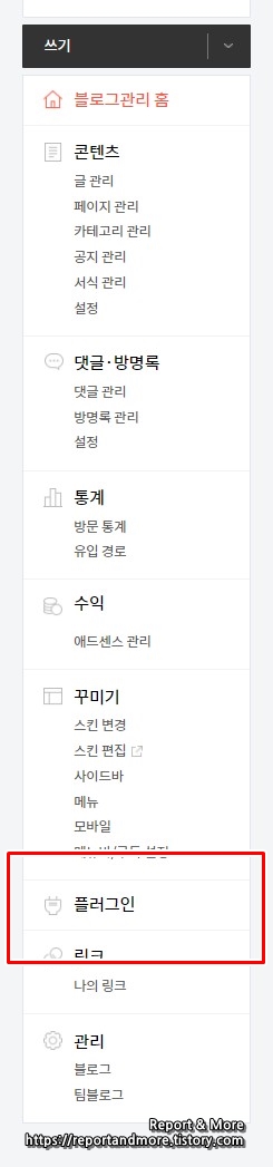 1. 내 티스토리의 [관리]에 들어가서, [플러스인]을 클릭.