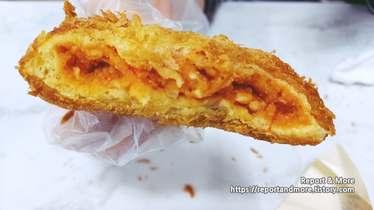 (2) 반죽은 역시, 일반 빵 반죽의 맛이 아니라, 꽈배기의 바로 그 반죽을 사용해서 그런지, 쫀득한 맛이었습니다. 약간 '돈가스'같은 느낌의 고로케만 먹다가, 반죽이 쫀득하니까 조금 어색하기도 하고, 새롭기도 했습니다.