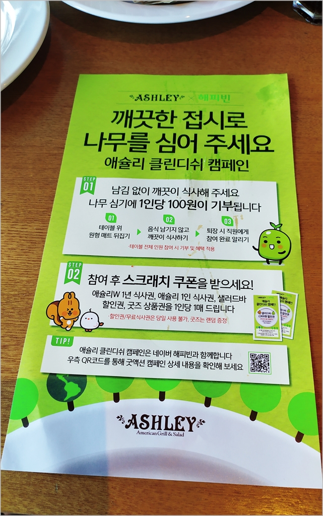 간단히 설명하면, 테이블에 '애슐리 클린디쉬'라고 쓰여있는 원형 매트가 있는데요,