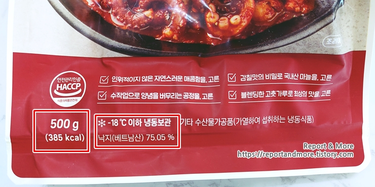500g의 중량에 총 385kcal의 열량을 가지고 있다고 하네요.