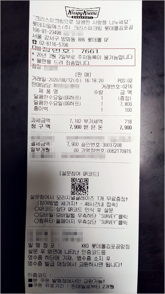 3. 2020년 3월 2일부터, '100만 원어치 도넛을 사도 무료 주차 안됨!'을 영수증에 아예 박제해 두었습니다. 허걱!