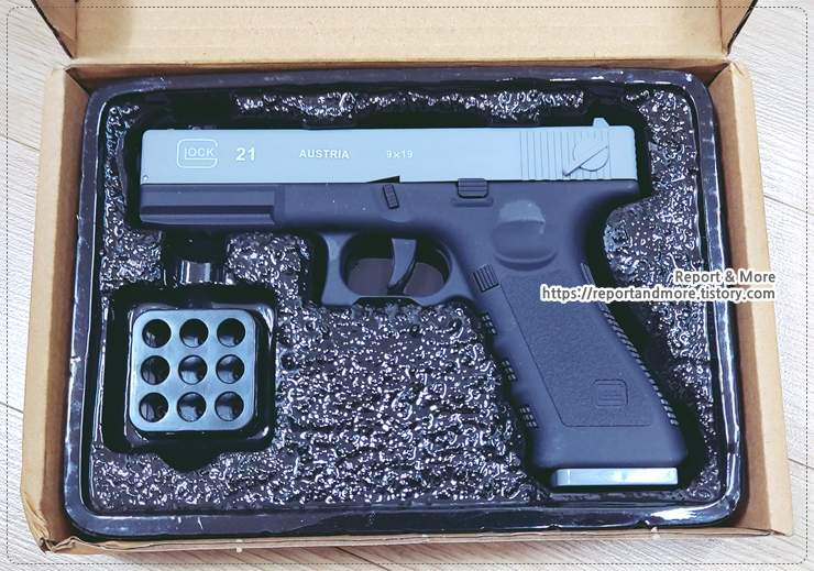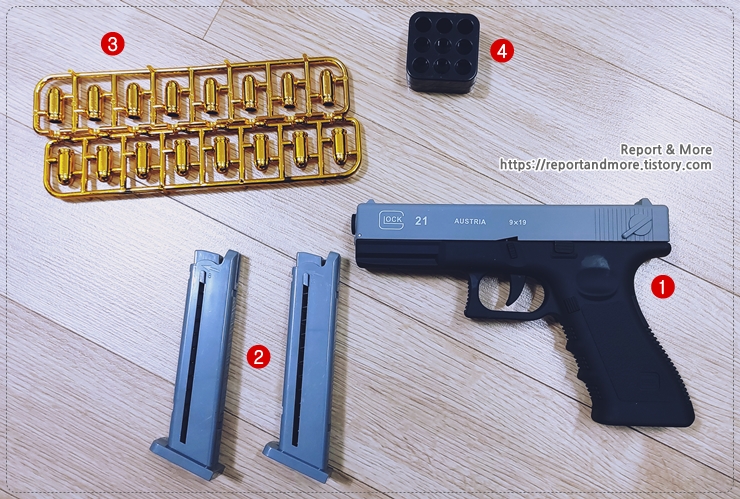 저는 글록(권총) + 추가 탄창 1개(총 2개) + 추가 총알 8개(총 16개) + 총알 보관함 1개 + 해외배송비 = 18,800원에 구입했습니다.