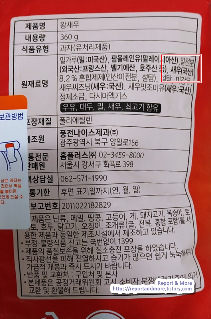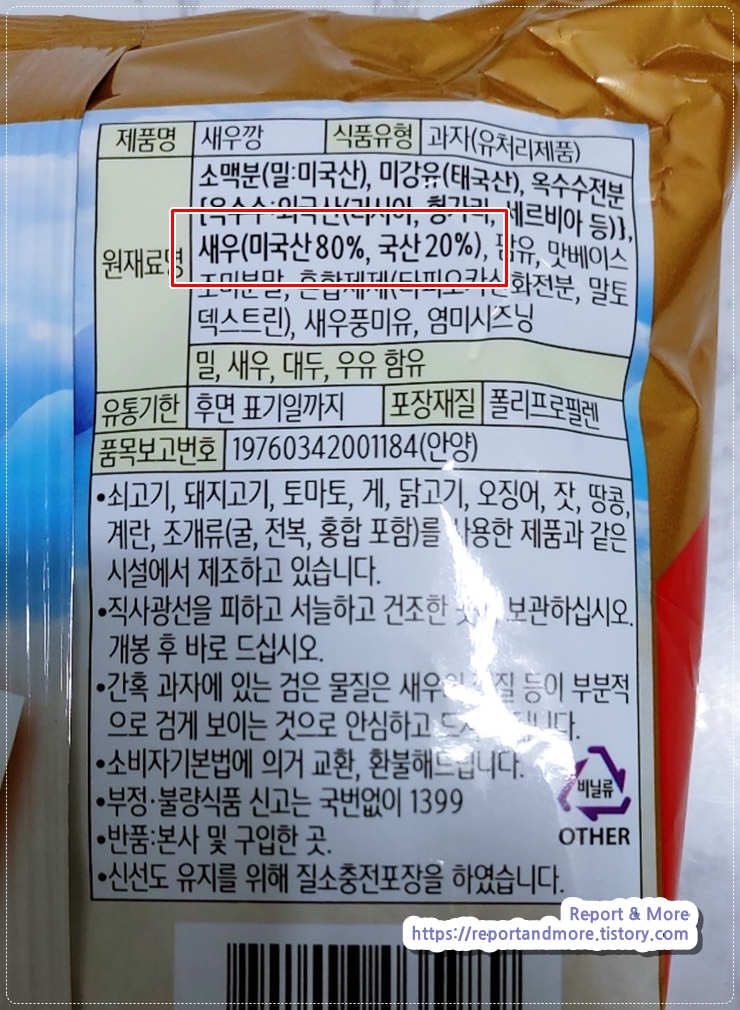 오호~ 뒤에 원재료명에도 '새우(국산)'임을 자랑합니다.