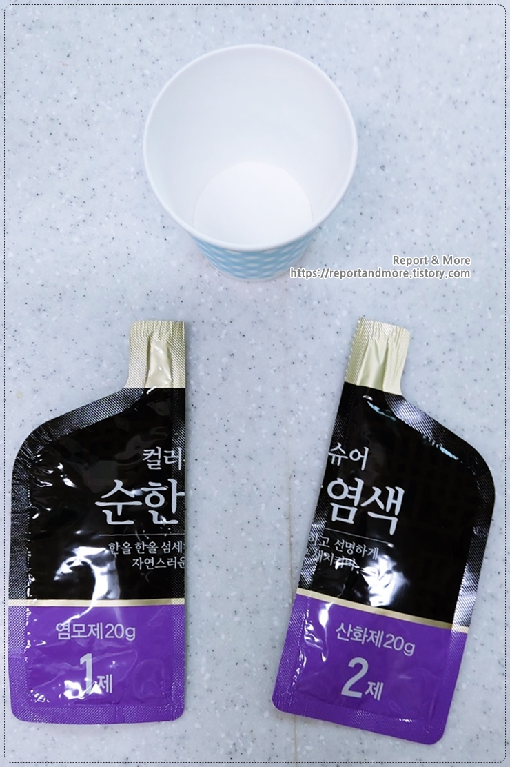 종이컵, 1제 염모제, 2제 산화제를 준비합니다.