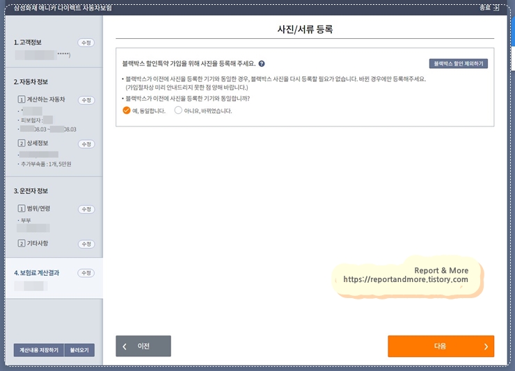 이 화면은 '블랙박스 할인특약' 가입 화면인데요,
