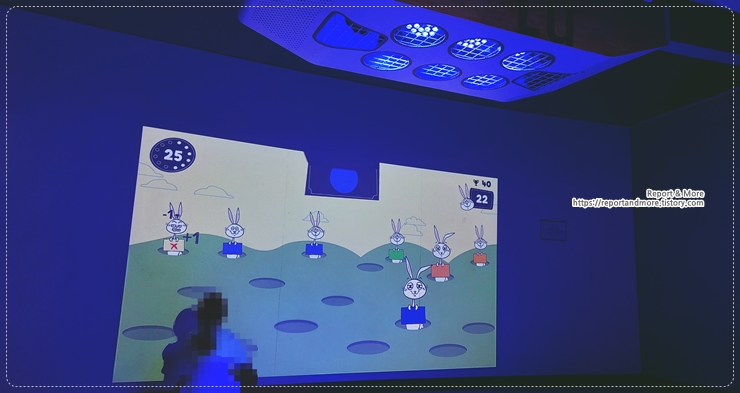 우리가 옛날에 했던 두더지게임(망치로 두더지 머리 때리는)을 벽 스크린에 하는 겁니다.