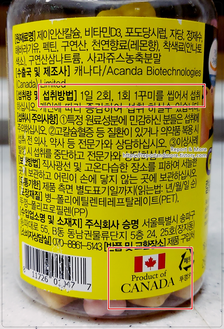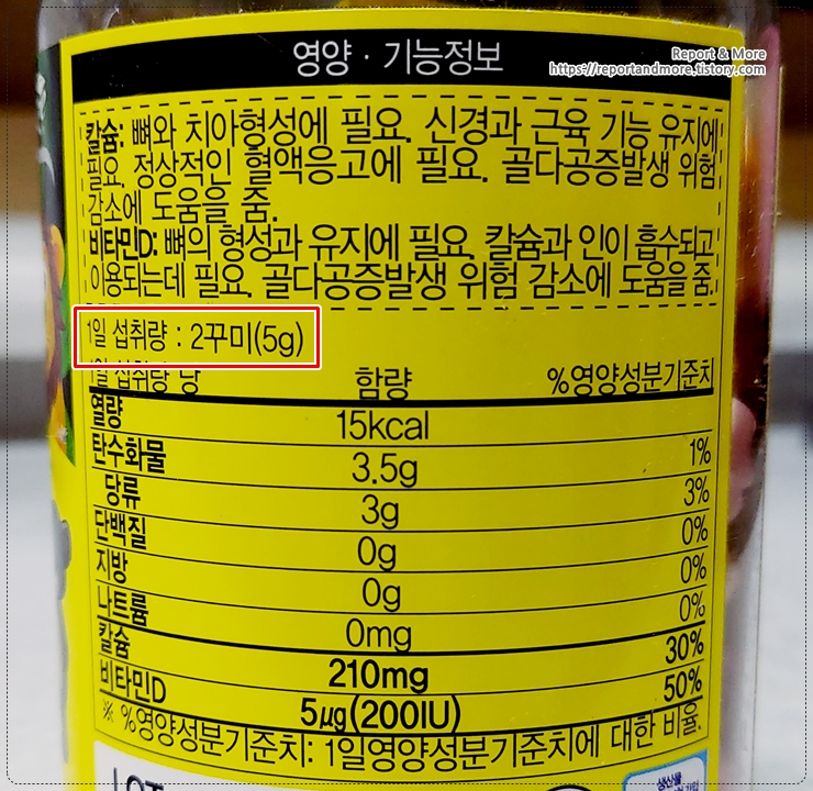 섭취방법은 1일 2회, 1회 1꾸미(젤리)를 씹어서 먹으라고 되어 있네요.