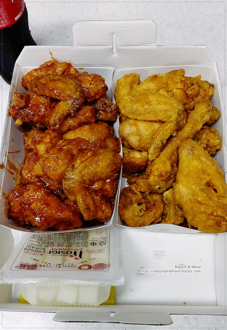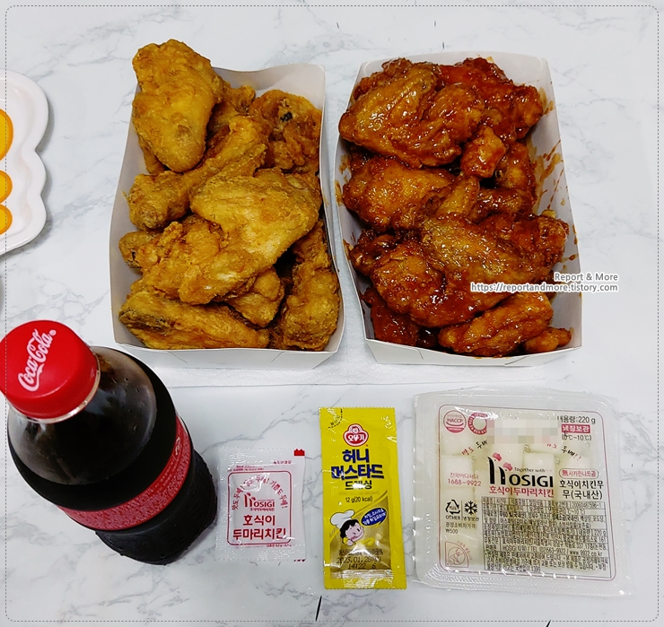 내용물은 후라이드치킨, 매운양념치킨, 500ml 콜라, 치킨무, 허니머스타드소스, 소금 입니다.