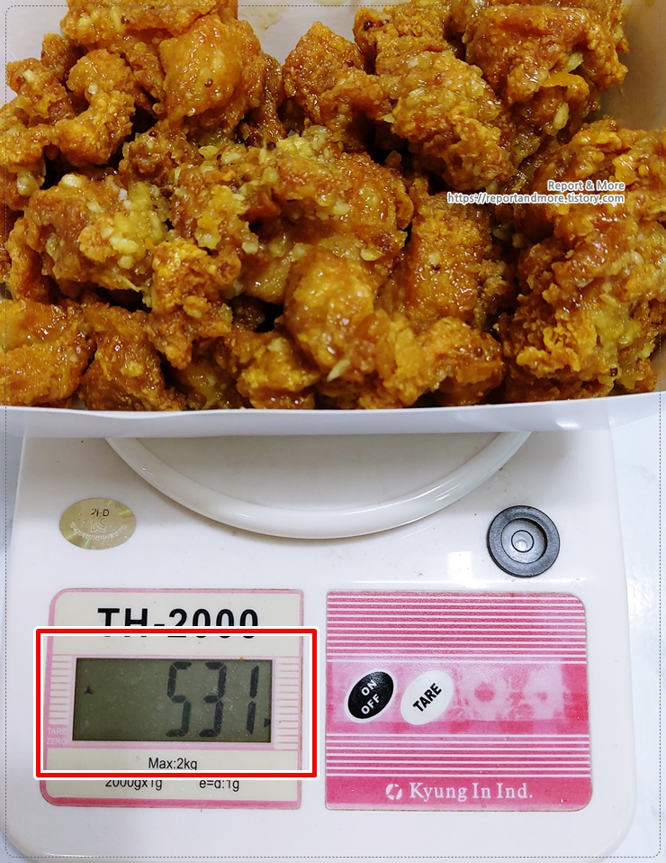 마늘톡겨자싸이순살치킨의 중량은 530g이지만, 531g을 주셨네요.