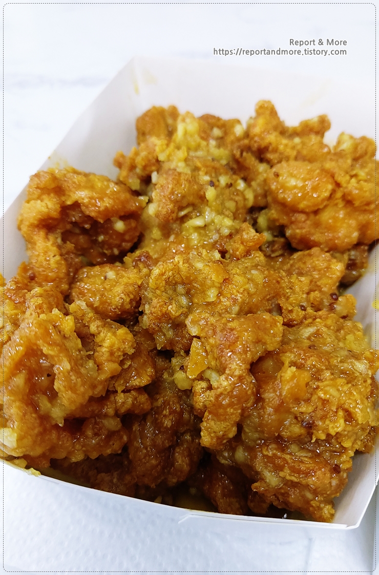 이번에는 '마늘톡겨자싸이순살치킨'을 가까이서 찍어 보았습니다.