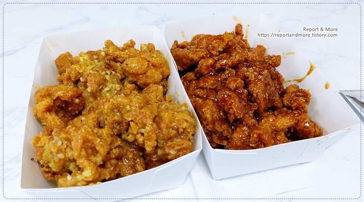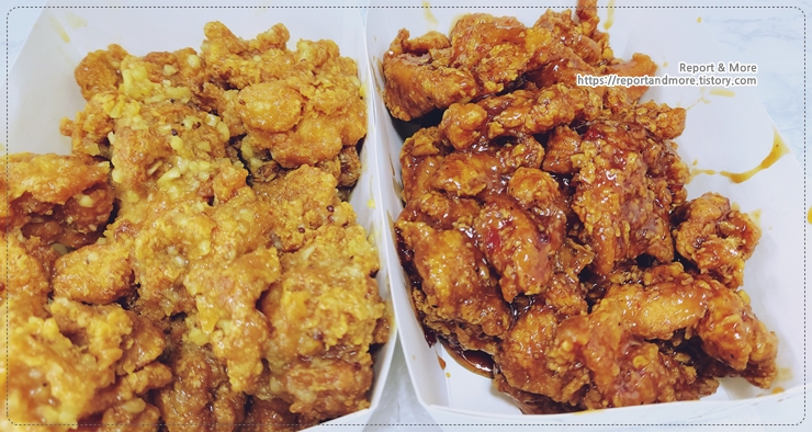 사진에서 왼쪽이 '마늘톡겨자싸이순살치킨'이고요,