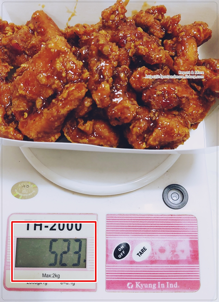 '꿀간장누룽지사이순살치킨'의 중량은 550g이지만, 523g을 주셨고요,