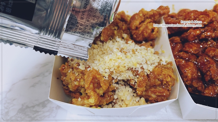 '꿀간장누룽지사이순살치킨'에도 '반'만 부어서, 맛을 비교해 보았습니다.