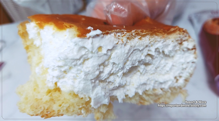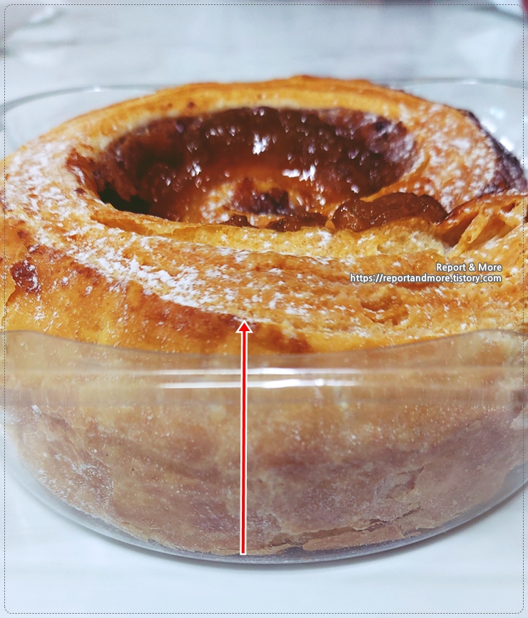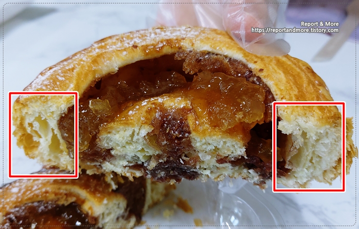여러 겹의 맛은 찾기 어렵고, 특히 가운데 부분을 보시면 그냥 덩어리져있는 모습이 보입니다.