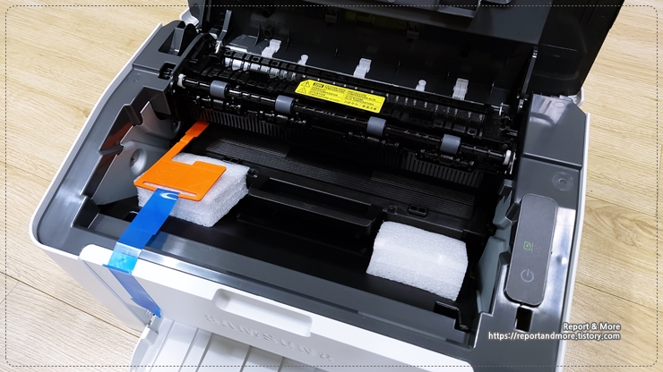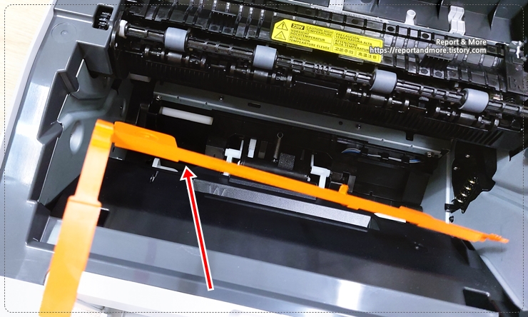 이 주황색 친구는 아마도 프린터 안에 있는 드럼(이미지 유닛)을 보호하는 것이 아닌가 추측합니다.