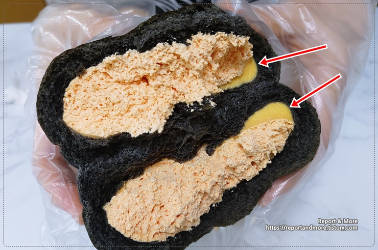가장 먼저 눈에 띄는 것은 '빵의 단면'이 '위에는 크림, 밑에는 치즈 베이스'라는 점입니다.
