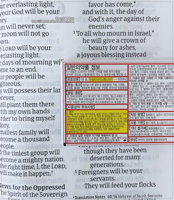 타이레놀 약상자의 뒷면 설명서와 함께 찍어 보았습니다.