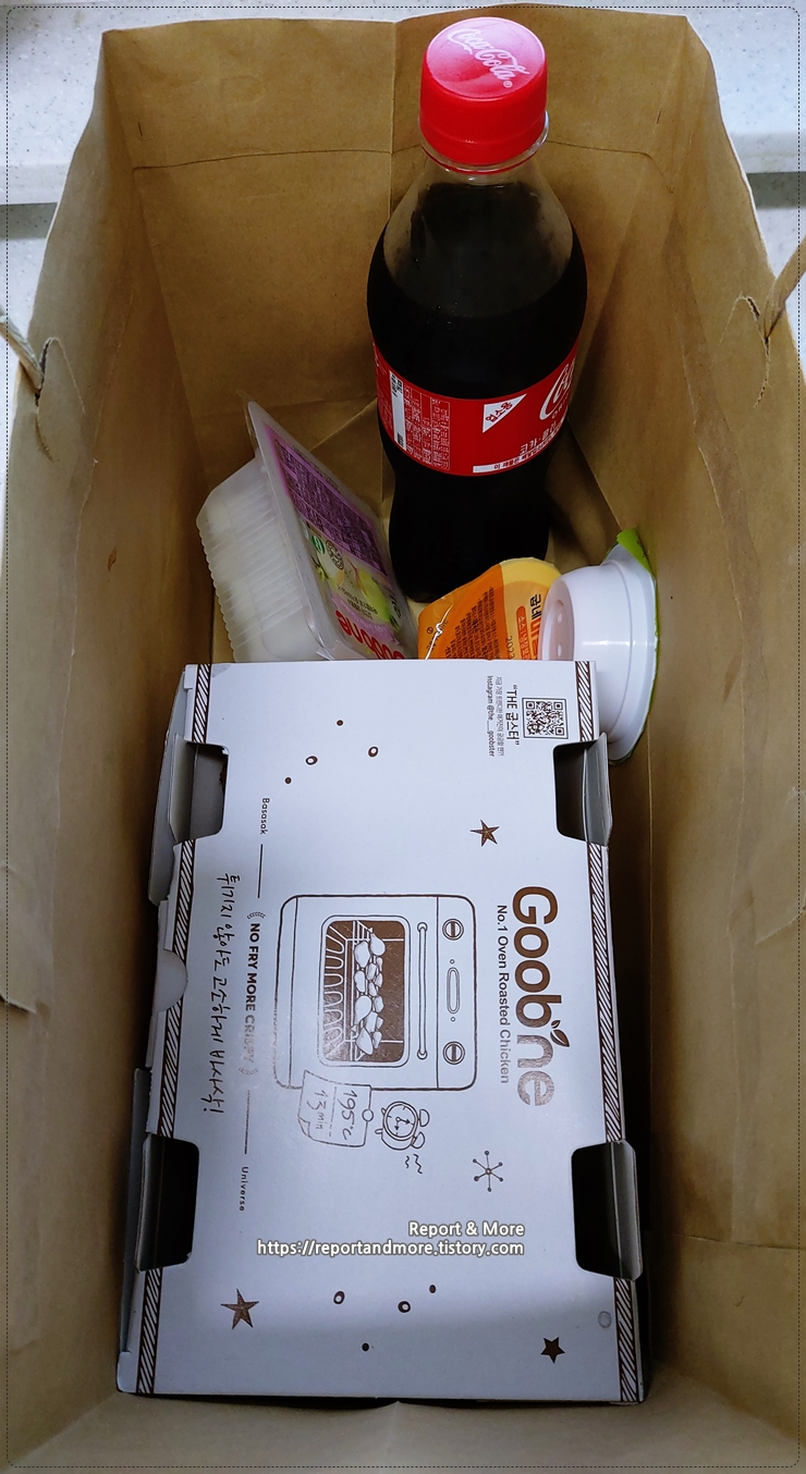 구성은 고추바사삭치킨, 소스 2개, 치킨무, 500ml 콜라 입니다.