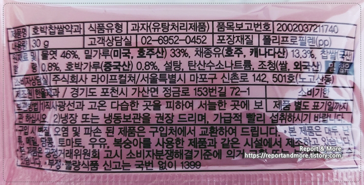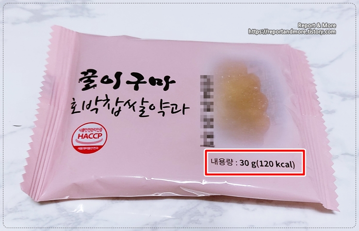 꿀이구마 호박찹쌀약과는 30g의 중량에 120kcal입니다.