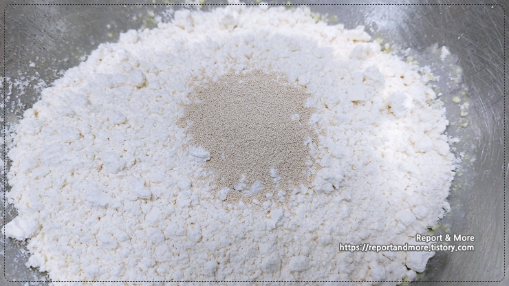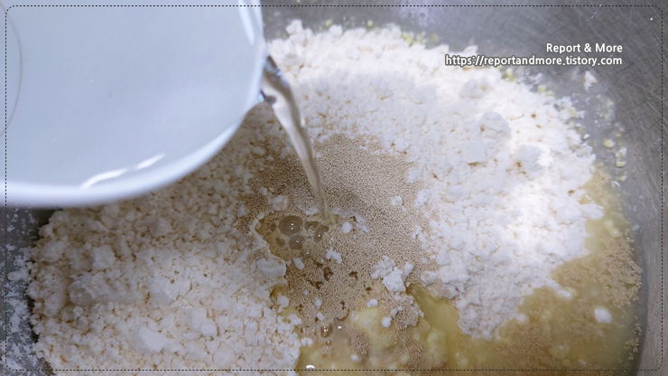 그렇기 때문에, 이스트가 반죽 사이 사이에 골고루 침투할 수 있도록 '프리믹스와 이스트'를 먼저 '골고루' 섞어 준 후에, 물을 넣게 됩니다.