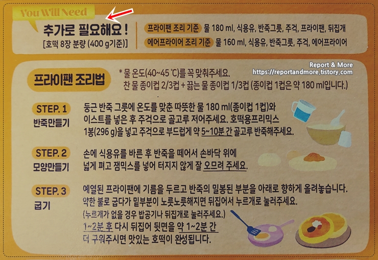 물 180ml, 식용유, 반죽그릇, 주걱, 프라이팬, 뒤집개가 필요하다고 친절하게 'You will need(이것이 필요해요 / 추가로 필요해요)'에 설명이 있네요.