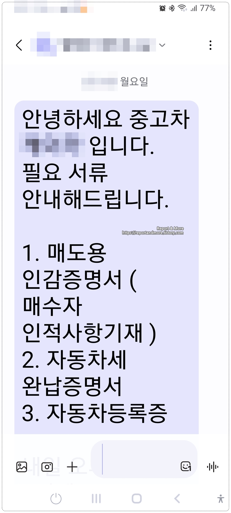 저의 경우는 딜러분께서 앞으로 진행될 사항과 함께 바로 문자로 필요한 서류에 대해서,