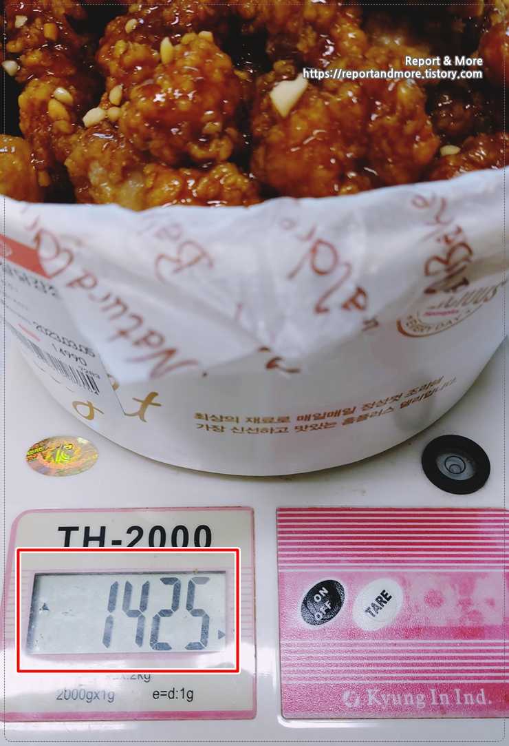 실제 닭강정의 무게는 1,392g 정도네요.