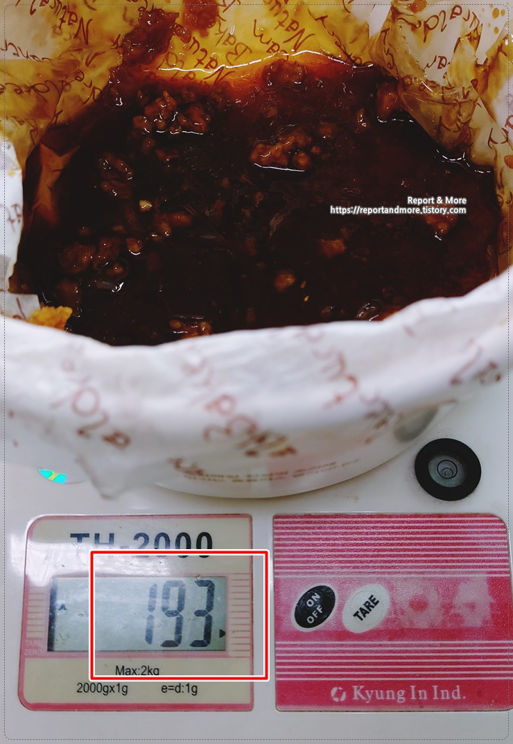 아무튼 남은 소스의 양은 193g - 통무게 33g = 160g 정도의 소스가 남았네요.