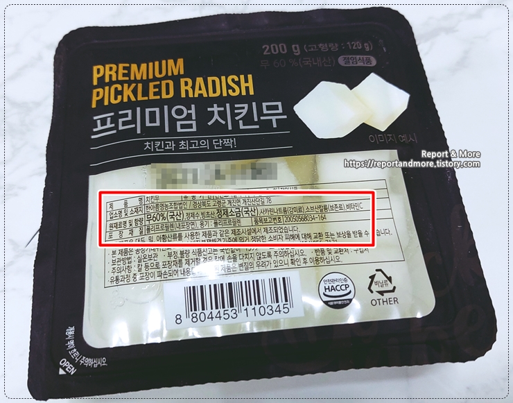 원재료은 60%의 국산무에, 빙초산과 사카린으로 맛을 냈습니다.