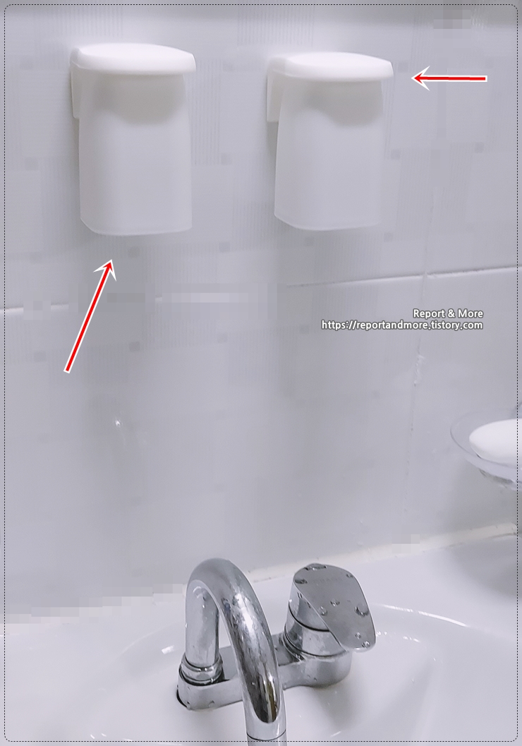 한개 정도는 좀 안보이는 곳에 둘 수도 있는데, 저희집처럼 2개를 고정할 때에는 '양치컵'에 '칫솔과 치약을 꽂아두는 컵', 거기다가 '비누를 올려 놓는 곳'까지... 생각보다 많이 답답해 보입니다. 자리 선정이 중요할 듯...