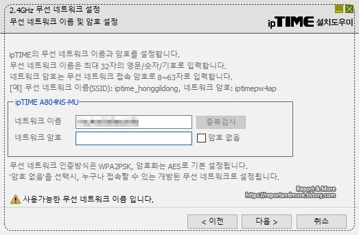 이번에는 [네트워크 이름]과 [네트워크 암호]를 설정하는 창이 나오는데요,