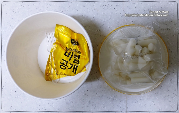 이번에도 가루형태의 소스와 떡볶이 떡, 그리고 투명한 색깔의 포크가 들어 있네요.