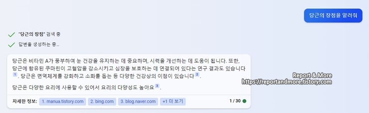 제가 검색사이트인 Bing에서 '당근의 장점을 알려줘'라고 물어보았더니,