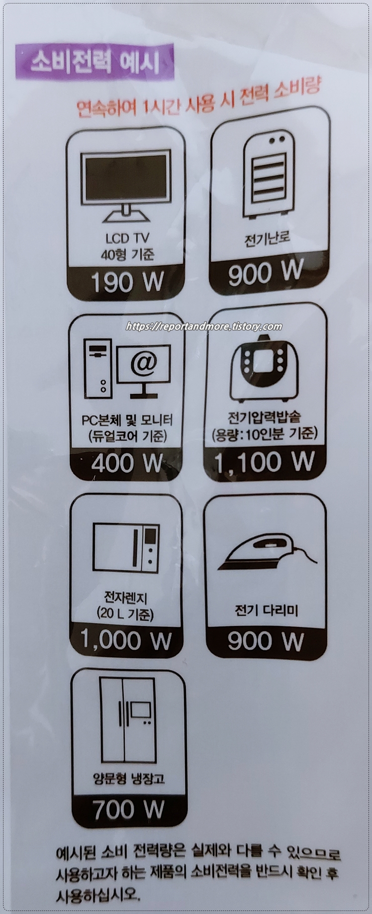 이렇게 제품 뒷면에, 소비 전력량의 예시가 나와 있습니다.