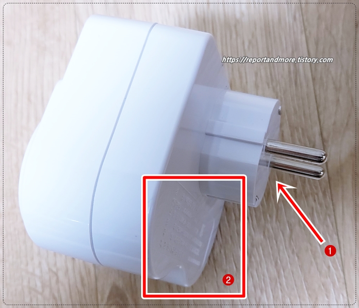 여기 보시면, (1) 전기 플러그의 위치가 제품의 위쪽에 자리 잡고 있습니다.