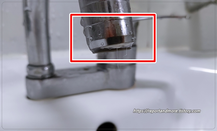 수도꼭지 끝에 보시면, 하얀 게 보이실 겁니다.