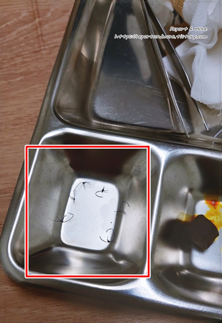 (1) 눈에 보이는 실을 날카로운 칼로 자른 후, (2) 핀셋으로 잡아 뽑기... ㅠㅠ