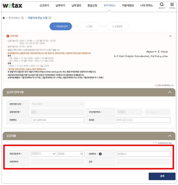 아래 [신고내용]에, [자동차등록지(역)], [차량번호]를 넣고, 검색을 클릭합니다.