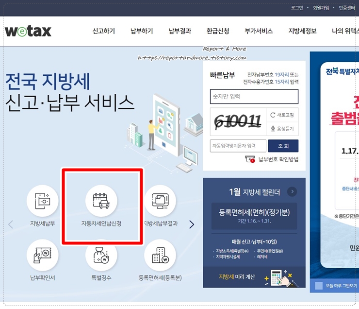 지금은 자동차세 연납시즌이라서, [자동차세연납신청]이 가장 눈에 띄는 자리를 차지하고 있네요.